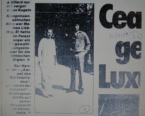 On December 31, 1989, the Austrian newspaper Kronen Zeitung published pictures of the Ceausescu family on page 6 (below). One of them shows the real Nicu Ceausescu together with his mother. This photo was retired by the owner (Viennareport, 1060 Vienna) immediately after having been published and had to be returned to a French agency. I offered any sum of money for that picture, but it was impossible to get it.